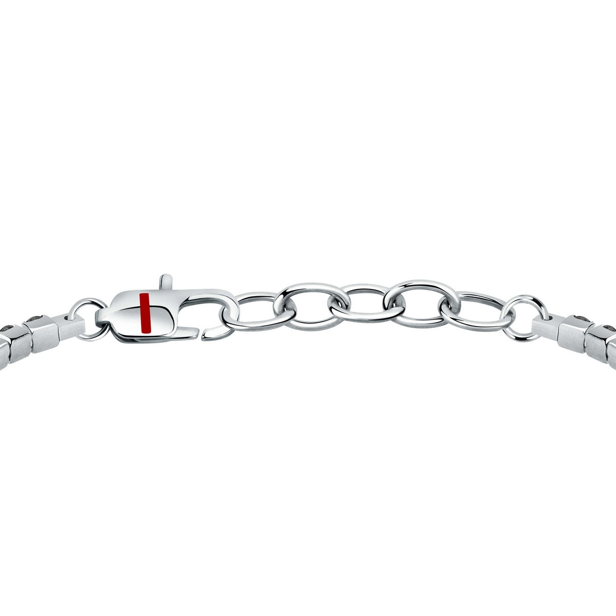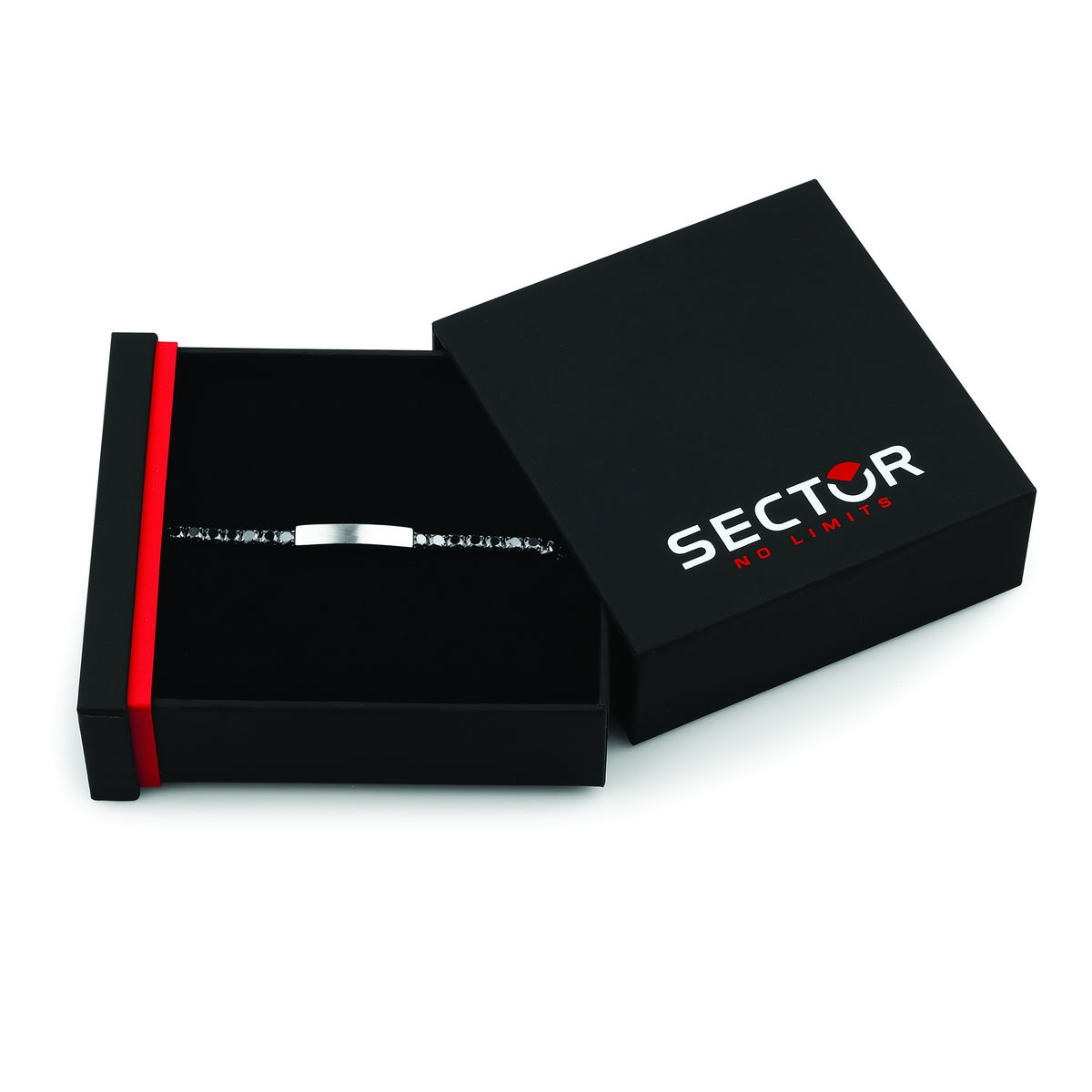 sector tennis bracelet with black cz and stainless steel tag